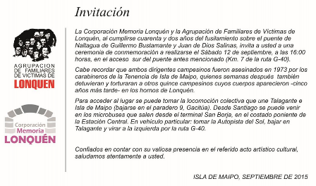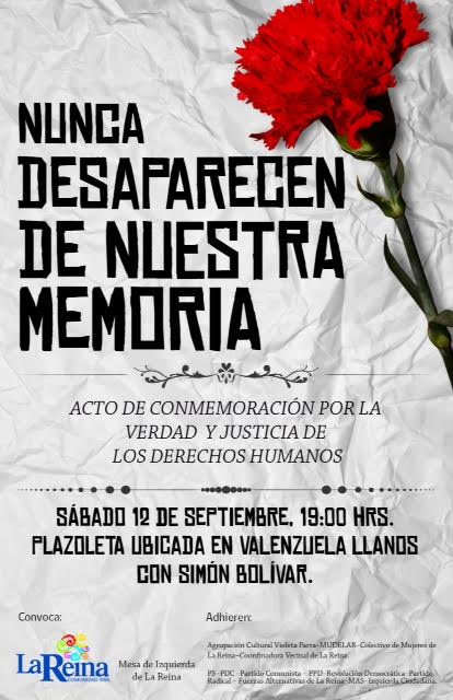 En esta ocasión, simbolizando a tod@s l@s mapucistas asesinados por la dictadura, realizaremos un especial recuerdo al compañero Carlos Carrasco Matus, detenido y asesinado en este recinto.